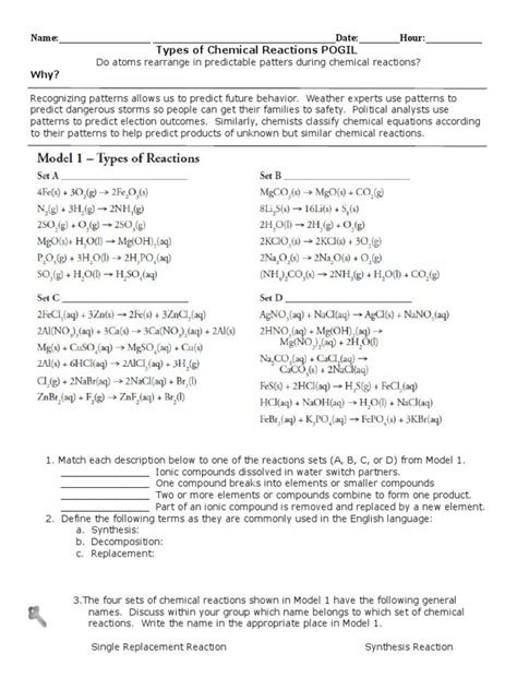 3.the four sets of chemical reactions shown in model 1 have the following general names. Classifying types of reactions pogil and answer key classifying chemical reactions ws 1 and answer key.pdf assigned as cw on 2/7/20 formulas and equations review distributed on 2/10/20. Chemical reactions can only occur if the activation energy is available and the molecules are correctly aligned. Check spelling or type a new query. We did not find results for: